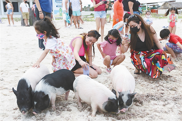2月12日,在墨西哥尤卡坦州普罗格雷索,人们在“小猪海滩”与小猪互动。