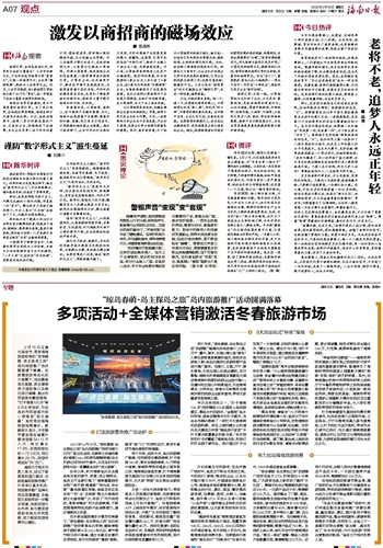 省旅文厅相关负责人表示,经过不断探索和强力推动,目前我省旅游宣传推广IP体系已基本形成,旅游宣传推广品牌化效应显著增强,全省旅文系统将进一步整合资源,活跃旅游文化市场,吸引更多游客前来观光休闲度假,助力国际旅游消费中心建设。