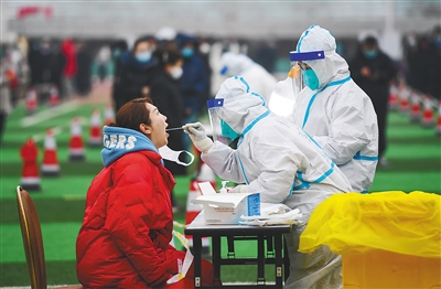 图为在呼和浩特市人民体育场临时核酸检测点,周边居民进行核酸检测。新华社发