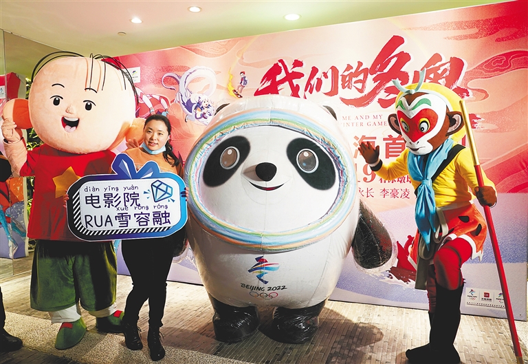 2月18日,参加首映礼的观众与“冰墩墩”、“孙大圣”和“大耳朵图图”合影。