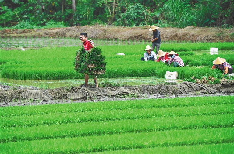 2月16日,在临高县博厚镇,农民趁着好天时在田间插秧。