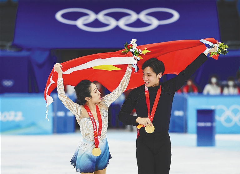 新华社北京2月19日电 (记者丁文娴 王恒志 张泽伟)掌声四起,热泪横流,隋文静/韩聪在19日的北京冬奥会花样滑冰双人滑比赛中力挫强敌、傲然登顶,为中国代表团夺得第九金。冬奥会即将“收官”,目前中国代表团超越美国代表团,以9金4银2铜升至奖牌榜第三。