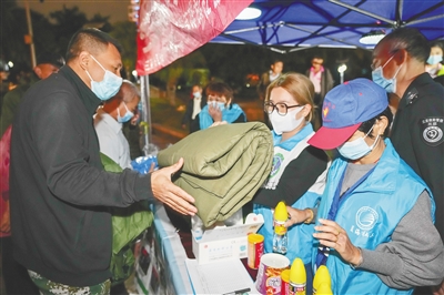 2月20日,受强冷空气影响,三亚气温骤降。为做好街头流浪乞讨人员救助工作,当晚,三亚市民政局、三亚市救助管理站等部门联合开展送温暖专项救助行动。图为社工为街头流浪人员送去御寒物资。