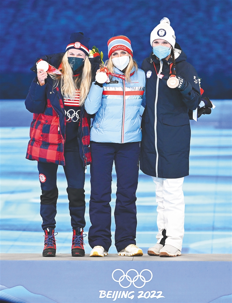 在全球亿万观众注视下,挪威运动员特·约豪格和俄罗斯奥委会运动员亚历山大·博利舒诺夫,先后登上越野滑雪女子30公里和男子50公里集体出发(自由技术)项目的最高领奖台。在充满祝贺和敬意的掌声中,获奖者们将奖牌举在胸前,用力挥舞花束,与世界一起分享这梦想成真的激动时刻。