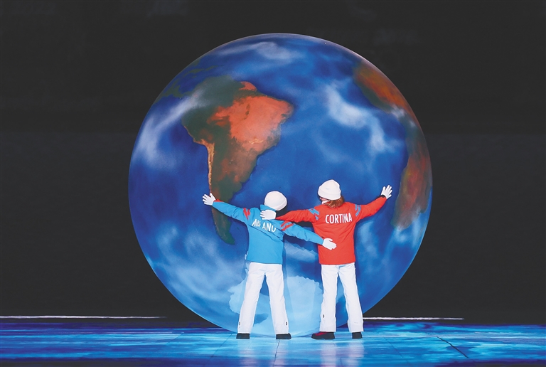循着场地边缘一道亮光,两位意大利小朋友推动手工制作的地球走向中央。下一届冬奥会举办地八分钟表演“双城璧合·聚力联辉”拉开序幕。四年后,活力四射的时尚之都米兰将携手山川环绕的科尔蒂纳丹佩佐,共襄冬奥盛会。山川与城市、自然与建筑相互映照,在共舞中寄寓着人类和自然间的彼此尊重、相互对话。
