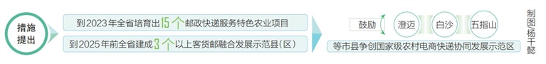 措施明确,提升邮政综合服务能力,支持邮政企业利用“村邮站+快递驿站+便民服务站”等模式建设“一点多能”的村级寄递物流综合服务站;促进农村寄递物流与电商产业协同发展,鼓励澄迈、白沙、五指山等电子商务进农村综合示范县争创国家级农村电商快递协同发展示范区;推动综合交通与寄递物流融合发展,鼓励开展“航邮合作”,加大对邮政快递业全货机运输航线、航空腹仓合作运输等支持力度;推进冷链寄递物流设施建设,支持邮政快递企业在美兰机场、凤凰机场临空经济区等重要物流节点建设冷链寄递物流基地;完善农特产品流通冷链服务体系,加快发展热带农产品、海鲜水产寄递服务,打造“快递+热带农产品”“快递+海鲜水产”特色项目;加强农村寄递物流基础设施建设,推广应用无人车等设备设施,推进农村快递包装的减量化、绿色化、循环化。