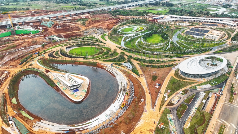 近日,俯瞰海口西海岸南片区公园核心区域。目前,该公园游客中心和水上剧场的主体工程已完成,预计公园核心区域今年6月底前投入使用。