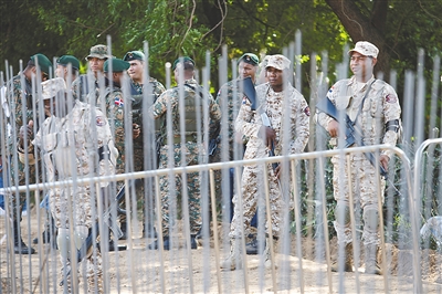 2月20日,在多米尼加西部边境达哈翁省的阿瓦尼科,多米尼加士兵在边境墙施工现场执勤。