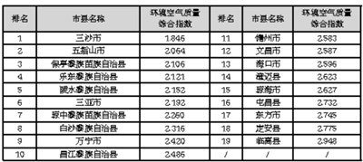 环境空气质量排名靠前的市县分别是三沙市、五指山市和保亭黎族苗族自治县,排名靠后的市县分别是临高县、定安县和东方市。2021年12月全省19个市县环境空气质量排名如右: