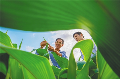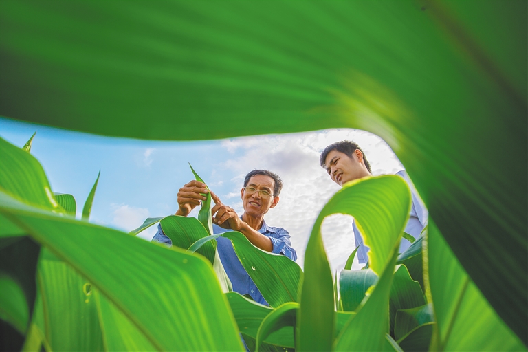 近日 ,位于三亚市崖州区的国家现代农业(种业)产业园,海南南繁产业发展有限公司柔性引进的育种专家马文全(左)为工作人员讲解玉米病虫害防治知识。近年来,三亚搭建产学研交流平台,不断完善“柔性引才”举措,引来四方之才,壮大我省南繁产业科研队伍。文/本报记者 邓钰 通讯员 张先毅 图/本报记者 袁琛