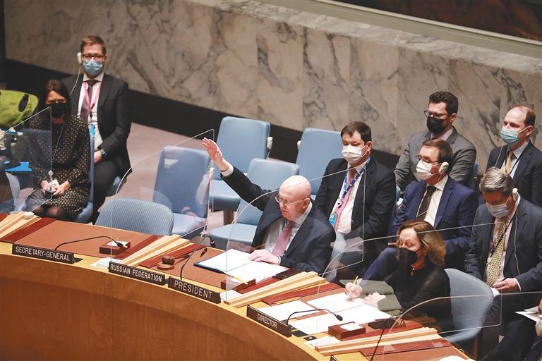 俄罗斯是安理会2月份的轮值主席。投票结束后,俄罗斯常驻联合国代表瓦西里·涅边贾在发言中指责决议草案发起者就乌克兰局势“编造故事”,指责西方试图掩盖其向顿巴斯地区大量输送武器的事实。涅边贾说,鉴于美国侵略别国的历史,它“没有资格进行道德教育”。