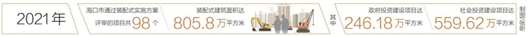 海口市住建局相关负责人介绍,近年来,海口大力发展装配式建筑,促进建筑产业优化升级,推动城市绿色发展。据统计,2021年,海口市通过装配式实施方案评审的项目共98个,装配式建筑面积达805.8万平方米,其中政府投资建设项目达246.18万平方米,社会投资建设项目达559.62万平方米,基本实现装配式建筑应做尽做。接下来,该部门将积极发挥装配式示范项目的示范引领作用,总结应用好建造经验,推动海口装配式建筑发展。今年,海口市住建局将积极谋求申报全国装配式建筑试点城市。