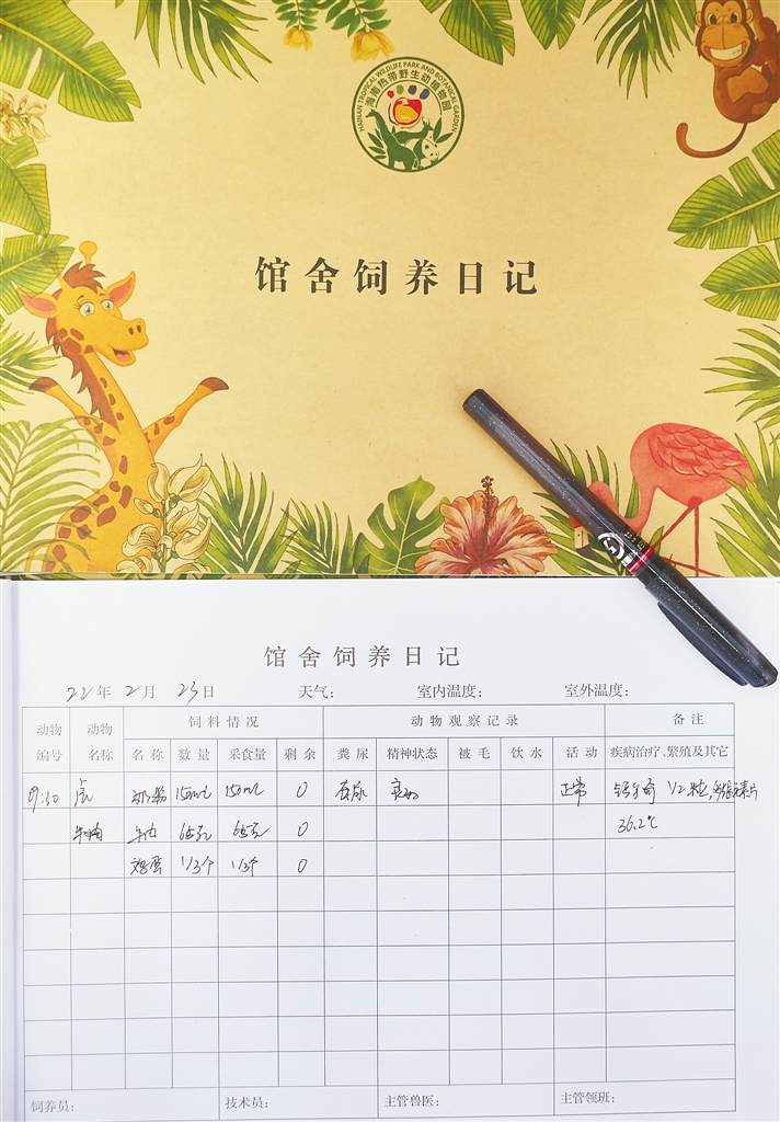 趁“旦旦”在休息区玩的空隙,蔡娇英拿出一本厚厚的馆舍饲养日记本开始填写,今天喂了哪些食物,采食量是多少,还剩多少,排便情况如何,精神状态怎样……每一项都记得很详细。