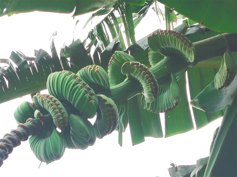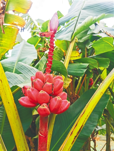一次可以结出1000个香蕉的植物,您见过吗?在琼海市大路镇湖仔村“世界热带水果之窗”里,就有一种植物,名叫千层蕉,别名象鼻蕉或千指蕉。它原产于东南亚,株高3至4米,由幼株到成株,这种植物与普通香蕉树并没什么不同,待到它开花结果时,其景象十分壮观。