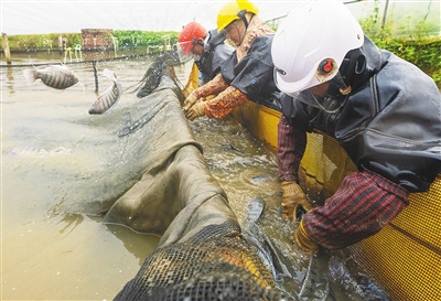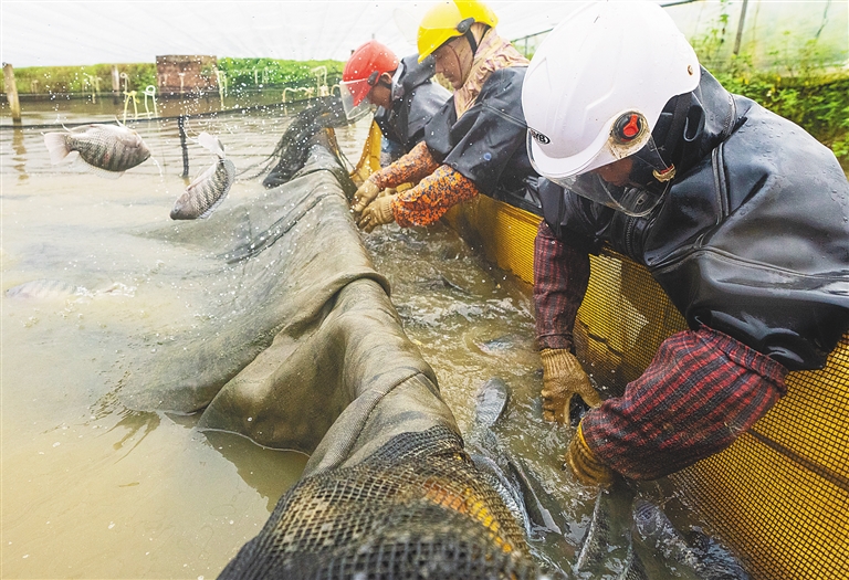 2月25日,在临高县博厚镇马袅村,海南宝路水产科技有限公司马袅苗种基地里,工人挑选罗非鱼取鱼卵。