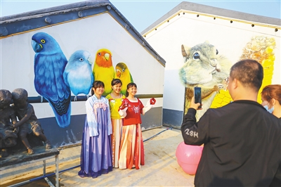 2月27日,正逢周末,不少市民游客在村中走走逛逛。他们拿起手机,或拍下焕发新生的老瓦房,或是在充满想象力的墙绘前合影,感受沉浸式的艺术体验。