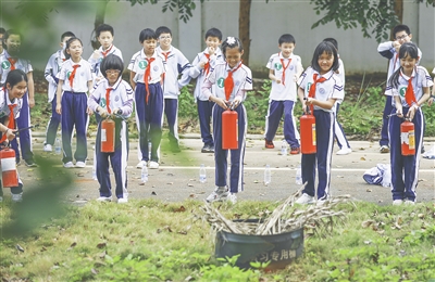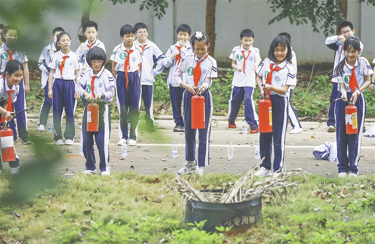 当天上午,海口市滨海第九小学美丽沙分校四年级约250名师生走进基地,开展安全应急综合演练活动。同学们体验了消防安全、应急救护、防溺水等板块,进行了灭火器操作演练、模拟报警、烟雾逃生、窗口逃生、海姆利克急救法等实操演练。