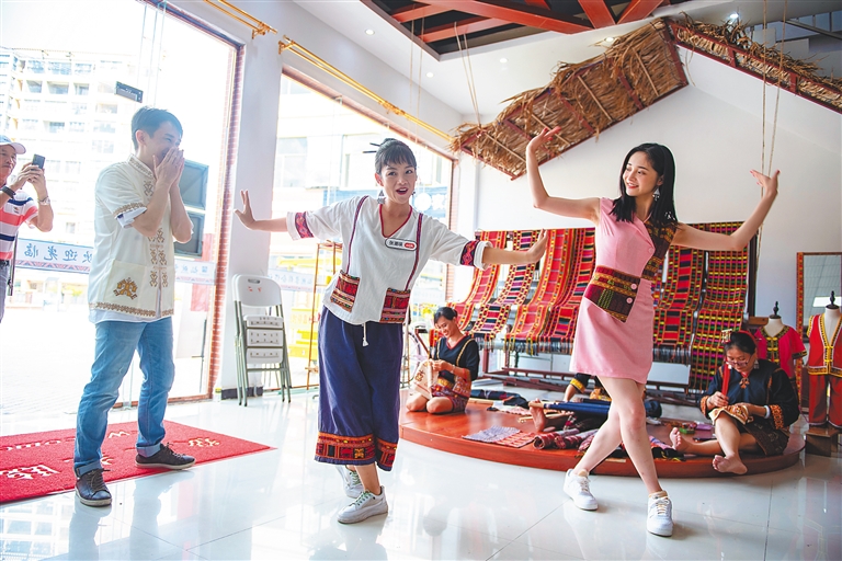 时尚博主和黎锦传承人(中)一起直播“卖货”,推荐白沙黎族特色产品。