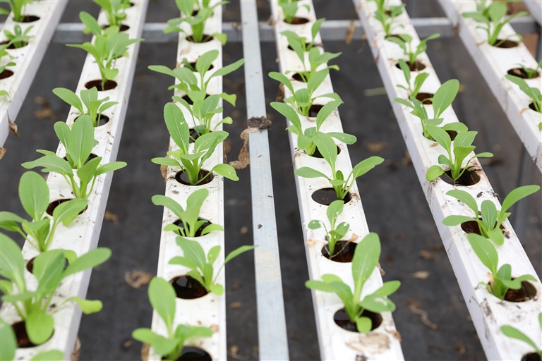 随意拎起一棵蔬菜,只见定植孔内完全没有泥土,蔬菜根部直接浸泡在缓缓流动的营养液中。“我们的蔬菜是喝着管道中循环流动的营养液长大的,这种栽培模式避免了使用农药、化肥对生态环境造成污染。”该基地负责人林丛介绍。