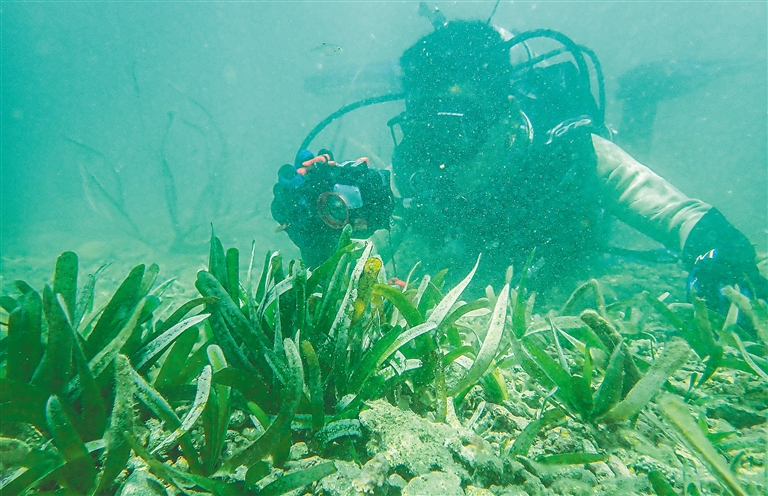 在文昌清澜港至高隆湾段海域,省海洋与渔业科学院海洋生态研究所工作人员查看海草床的生长情况。本报记者 袁琛 摄