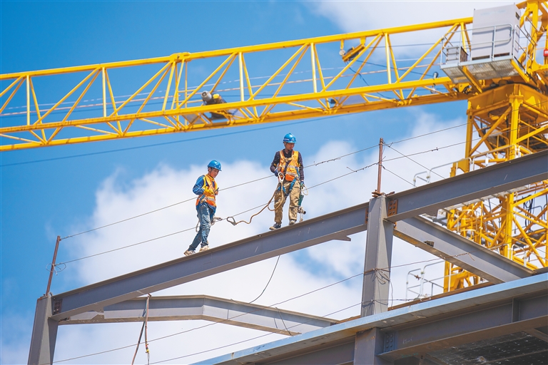 3月9日,在海口市美兰区的海南省公共卫生中心项目现场,工人做好保护措施在高处作业。