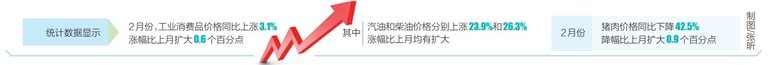 统计数据显示,2月份,工业消费品价格同比上涨3.1%,涨幅比上月扩大0.6个百分点,其中汽油和柴油价格分别上涨23.9%和26.3%,涨幅比上月均有扩大。此外,受原油、有色金属等国际大宗商品价格上涨等因素影响,2月份全国工业生产者出厂价格指数(PPI)环比由降转涨,同比涨幅回落。