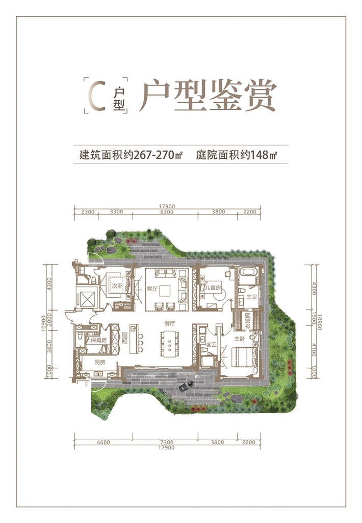 建面约229~238m2意式摩登B’户型,汲取意大利现代美学概念,融汇大量木饰面设计,营造稳重而端庄的空间氛围。起居、会客与寝居的动线科学划分,生活层次条理分明。指引高端住宅朝向的约10米大横厅,连接厨房、庭院,不止于宽,更是奢阔明亮的家庭社交场。厨房中岛台与餐厅形成联动,方便少数人就餐,更满足大家庭聚餐的需求。270°庭院兼顾多种生活场景,是绿意鲜氧环拥的跑道,是瑜伽、撸铁的健身房,是高尔夫推杆练习场,更是好友相聚的派对场所,一方庭院,无限“享”法。