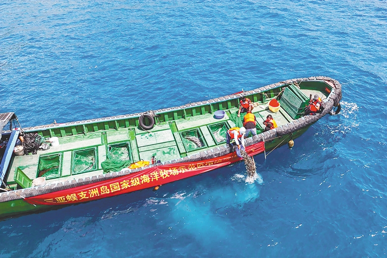 3月10日,在三亚蜈支洲岛海域,工作人员在增殖放流鱼苗。