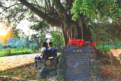 一望无垠的稻田随风飘荡,细碎的阳光从头顶的枝叶缝隙中穿过,在地上留下斑驳的光影。坐在爱情树下,一种悠然忘尘的宁静在内心油然而生,令人不由得感慨定安山水的美不胜收,又感佩于定安人文资源的魅力之深。