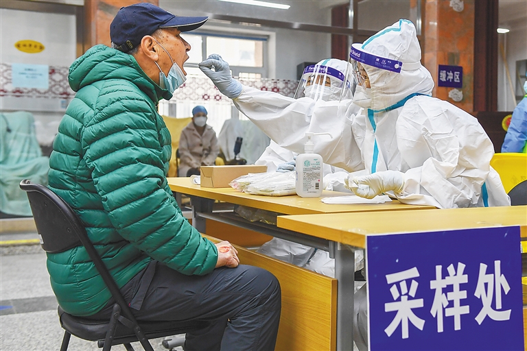 图为3月10日,在吉林省长春市朝阳区红旗街道一核酸检测点,工作人员为居民进行核酸检测采样。