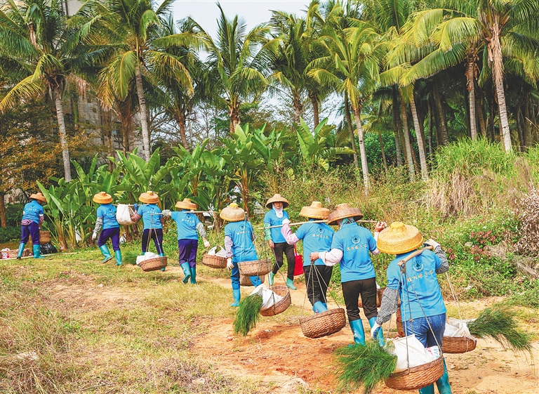 3月11日,昌江黎族自治县植树“娘子军”在棋子湾栽种海防林树苗。本报记者 陈元才 摄