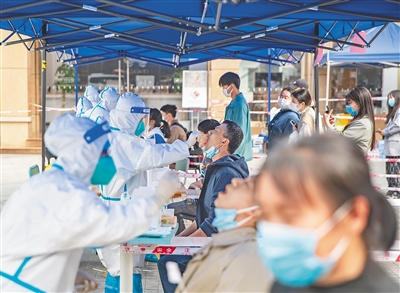 3月12日,在重庆大学城熙街,居民在进行核酸检测。