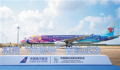本报海口3月13日讯 (记者罗霞)3月13日,第二届中国国际消费品博览会倒计时30天暨“消博号”首航仪式在海口美兰国际机场举行。全球首架消博会主题彩绘飞机——中国南方航空“消博号”亮相,并成功执行广州至海口的首航航班。