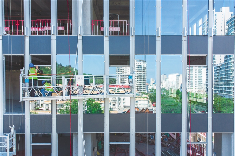 近日,在三亚中央商务区五矿国际广场项目工地,工人正在进行玻璃幕墙施工。该项目拟推出“企业总部基地+山海全景商办空间+精品消费”的组合产品,打造集科技研发、智慧办公、绿色商街为一体的国际5A甲级写字楼。项目预计在今年底正式交付使用。本报记者 武威 摄