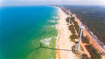3月12日,在文昌市铺前、锦山镇沿海,30多台巨型大风车在海滨一字排开,吸引不少春游的人们前来观光。随着海南环岛旅游公路建设的进一步完善,这种清洁能源设备将成为琼北一道亮丽的风景线。特约记者 蒙钟德 摄