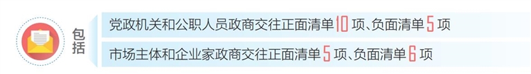 文件列举党政机关和公职人员政商交往正面清单10项、负面清单5项,市场主体和企业家政商交往正面清单5项、负面清单6项,对清单内容做了规定。