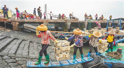 3月14日早晨,儋州市白马井中心渔港,码头上人来车往,各式海产品在市场上交易,销往省内外。