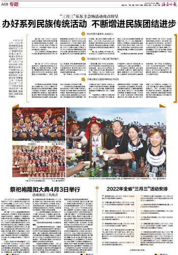 五指山市委常委、副市长王锡飞表示,传承和发展优秀民族文化,是五指山市开展海南黎族苗族“三月三”节庆活动的主线,今年“三月三”节庆活动内容丰富、主题鲜明,充分展示文化融合、生态融合、民俗融合的特点,紧扣民族团结进步主题,精心筹备了“三月民族情,奋进新征程”主题文艺晚会、黎族竹木器乐比赛、五指山画展和“铸牢中华民族共同体意识”学术研讨会、“海南热带雨林和黎族传统聚落”申遗研讨会等一系列活动,充分展现五指山市近年来经济社会文化建设新成就和营造民族团结进步社会氛围。