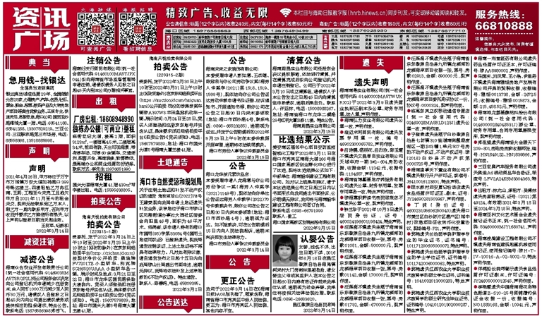 我司于2022年3月14日在《海南日报》A08版刊登了,落款名称,海南省海口市秀英区中级人民法院,更正为《海口市秀英区人民法院》其他内容不变。