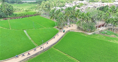 3月13日,在定安县龙湖镇高林村,游客在田间骑行。