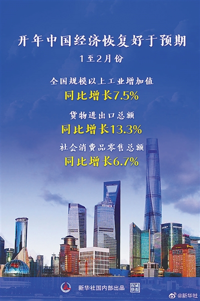 新华社北京3月15日电 (记者魏玉坤 王雨萧)多重风险挑战下,开年中国经济恢复好于预期。国家统计局15日发布的数据显示,1至2月份,国民经济持续稳定恢复,新动能继续成长,高质量发展取得新进展。