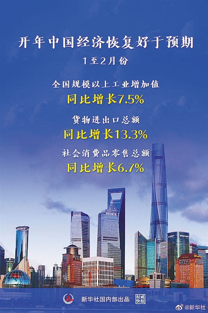 “综合来看,在宏观政策发力和市场主体努力的共同作用下,1至2月份,我国经济恢复的势头向好,为今年一季度开好局奠定了坚实基础。”国家统计局新闻发言人、国民经济综合统计司司长付凌晖说。