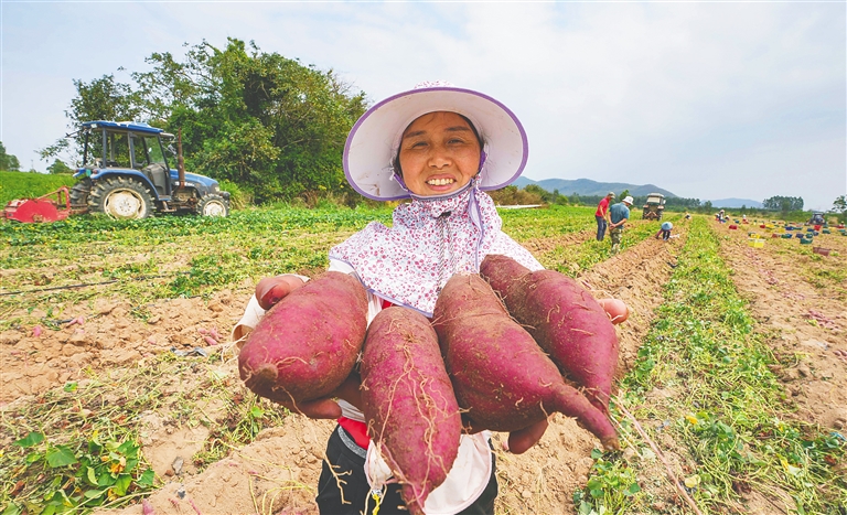 近日,昌江黎族自治县海尾镇种植户看着准备装车售往外地的地瓜,喜笑颜开。