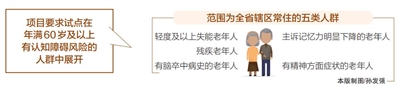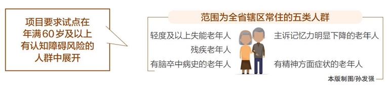 项目要求试点在年满60岁及以上有认知障碍风险的人群中展开,范围为全省辖区常住的五类人群:轻度及以上失能老年人;残疾老年人;有脑卒中病史的老年人;主诉记忆力明显下降的老年人;有精神方面症状的老年人。