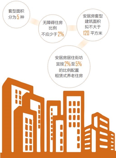 在配套设施方面,要求安居房居住街坊宜按2%至5%的比例配置租赁式养老住房。同时,安居房居住街坊宜适当配置公共客厅、公共食堂、公共厨房、共享农场、共享果园等增强邻里交往的公共设施。每个居住街坊宜设一处共享种植绿地;五分钟生活圈内宜设一处公共食堂。