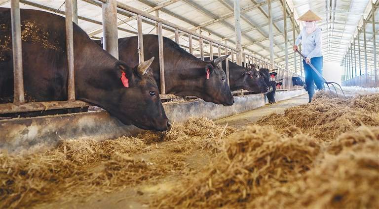 3月16日,在澄迈县福山镇红光农场肉牛繁育示范基地的幸福牛场,农户正在给牛喂饲料。
