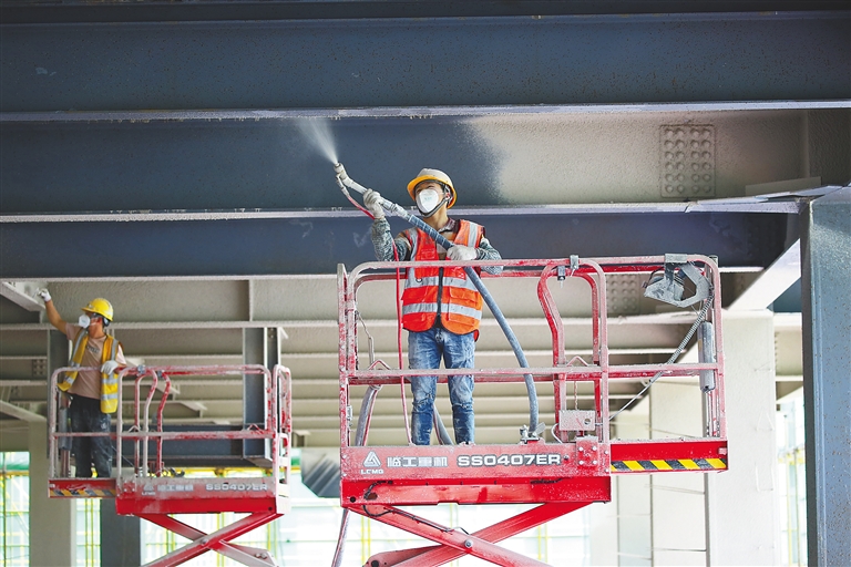 3月17日,海口市国际中医中心项目建设现场,工人在中医特色医疗楼进行防火涂料喷涂施工,该楼主体将于本月底全面封顶,实现年度首个节点目标。据了解,该项目总用地面积2.9万余平方米,建设内容包括新建门诊医技住院综合楼、中医特色医疗楼、科研应急保障综合楼及附属建筑。项目建成后,可提供优质中医医疗服务,助力海口市中医药产业传承和创新发展。本报记者 张茂 摄
