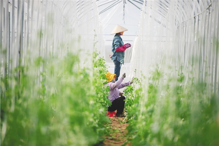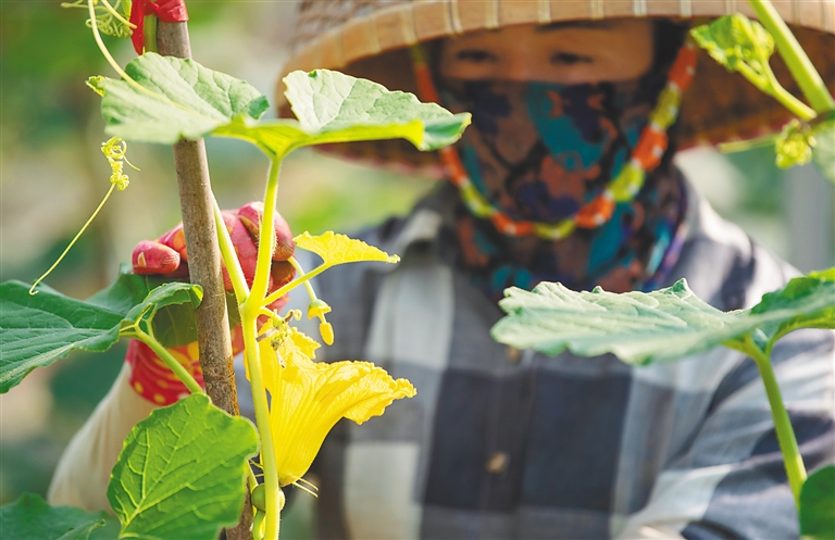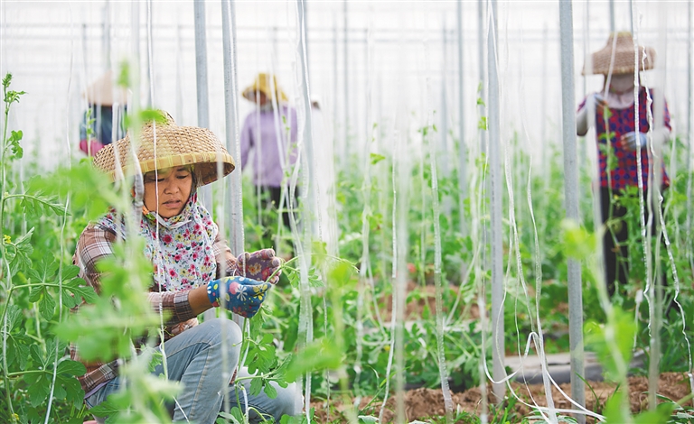 日前,在位于三亚市崖州区的国家现代农业(种业)产业园农作物新品种新技术田间展示推广中心,海南农垦南繁产业集团组织农户开展田间管理工作。在现场,农户们挂好牵引绳,以便瓜类作物攀爬生长(见图①②③)。