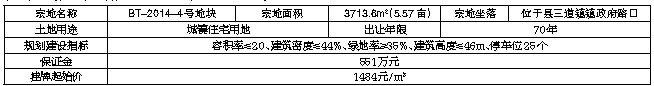 五、其他需要公告的事项:(一)该宗土地为在海南省住房和城乡建设厅备案的2018年棚户区改造计划项目,竞得人取得土地使用权后,需按县政府分配的棚户区改造指标建设38套棚改安置房,总建筑面积不低于2228.16m2,棚改安置房户型需按三房二厅一卫、二房一厅一卫(面积在75m2至80m2之间)进行设计和建设(最终以县政府审定批复的设计方案为准),统一精装交付。由保亭黎族苗族自治县棚户区改造工作领导小组办公室组织特定安置单位或群体按限定价格进行回购。具体安置单位或群体名单以及可购买面积等购买条件由保亭黎族苗族自治县棚户区改造工作领导小组办公室提供。本项目棚改安置房和配套安置商业用房回购限定价格统一为:建筑面积1628.05元/m2。(二)特定安置单位或群体实际购买棚改安置房面积超过可购买面积以上的部分,销售价格以县政府批准的指导价格执行。(三)安置后剩余的住宅用房用于内销型商品住宅,须遵守海南省和保亭黎族苗族自治县房地产管理的相关规定。(四)竞得人取得土地使用权后,应严格按照规划要求建设,涉及绿化、环保、消防、交通管理等应符合国家和海南省的有关管理规定。(五)BT-2014-4号地块现有地上建筑物2462.15m2,土地及地上建(构)筑物、附着物一并挂牌出让,竞得人需在缴付土地出让金的同时另支付建(构)筑物、附着物价款442.4484万元(详见相关房屋价值评估报告)。(六)本次成交价款不包括各种税费(相关税费由双方按规定缴纳),挂牌佣金由竞得人按有关规定支付。(七)竞得人从国有建设用地使用权出让合同生效之日起60日内付清土地出让金(已缴交的保证金可抵充土地出让金)。