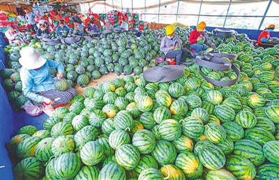 3月16日,在儋州市中和镇七里村,村民正在打包刚采摘回来的西瓜。据悉,去年该村推进高标准农田建设和撂荒地流转,引进企业种植西瓜,目前开始采摘上市。该村西瓜种植面积六百多亩,销往省内外市场。